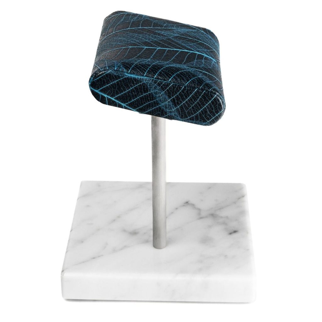 Stojan The Watch Stand je ručne vyrobený v Európe a je pripevnený k masívnemu talianskemu mramorovému podstavcu pomocou oceľovej tyče. Vrchný materiál vankúša pochádza z technológie HIRSCH Nature a pozostáva zo skutočných listových kostier.