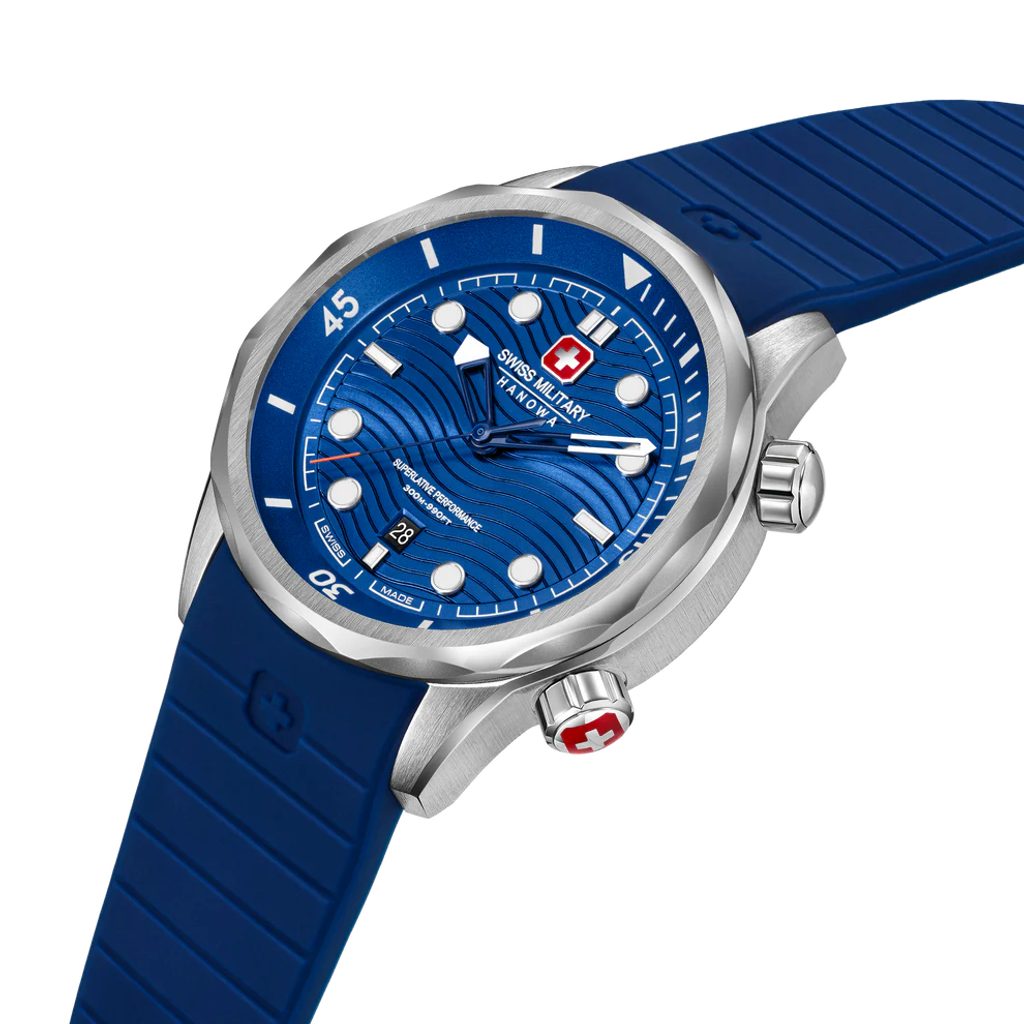 Hodinky zaujmú športovým modrým ciferníkom s prehľadným usporiadaním a zaujímavým vlnovkovým vzorom. Robustné 43 mm oceľové puzdro je vybavené dvoma skrutkovacími korunkami - jednou na nastavenie času, druhou na nastavenie času potápania. Hodinky sú vybavené aj dátumovkou na pozícii 6 hodín a kvalitným zafírovým sklíčkom odolným proti poškriabaniu.