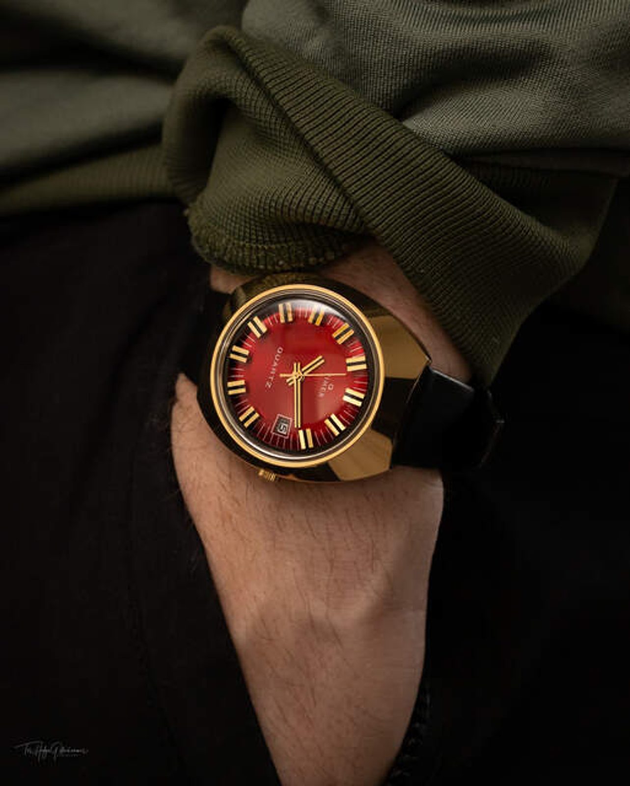 V oceľovom puzdre s priemerom 39 mm a leštenou zlatou povrchovou úpravou sa nachádza bordový ciferník, ktorý slúži ako pozadie pre výrazné ručičky a indexy v retro štýle. Model je vybavený vkusne zakomponovaným okienkom s dátumovkou umiestneným na pozícii 3 hodín. Všetko chráni akrylové sklo.