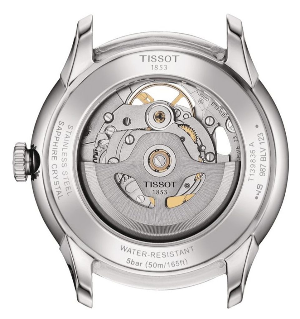 Hodinky Tissot T1398361104800 majú elegantné puzdro vrátane strojčeka vyrobené z ušľachtilej ocele. Vo vnútri hodiniek spoľahlivo pracuje švajčiarsky mechanický strojček sautomatickým náťahom Powermatic 80, ktorého chod možno pozorovať cez skeletovaný ciferník a priehľadnú zadnú stranu puzdra. Jeho základom je spoľahlivý strojček ETA 2824, pracuje s frekvenciou 21 600 polofrekvencií za hodinu a má 25 nastavení kameňov. Rezerva energie náťahu je superlatívnych 80 hodín. Zotrvačník tohto strojčeka je vyrobený zo zliatiny Nivachron, ktorá je odolnejšia voči magnetickým poliam a teplotným zmenám a výsledkom je lepšia presnosť hodiniek. Strojček má funkciu "hacking" (zastavenie sekundovej ručičky počas nastavovania) a možnosť ručného naťahovania korunkou.