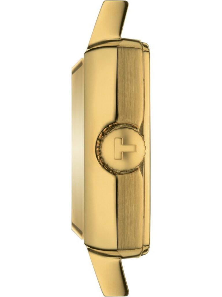 Model Tissot T0581093603103 zaujme svojím neobvyklým štvorcovým tvarom puzdra. Strieborný ciferník je chránený zafírovým sklíčkom s vysokou odolnosťou proti poškriabaniu. V puzdre z ušľachtilej ocele v zlatej PVD úprave sa nachádza švajčiarsky batériový strojček ETA 901.001 s tromi kameňmi. Vodotesnosť hodiniek je 30 m - sú vhodné na náhodný kontakt s vodou pri umývaní rúk a v daždi. Hodinky držia na zápästí vďaka elegantnému remienku z ľahkej kože. V balení potom nájdeme ešte tri náhradné remienky.