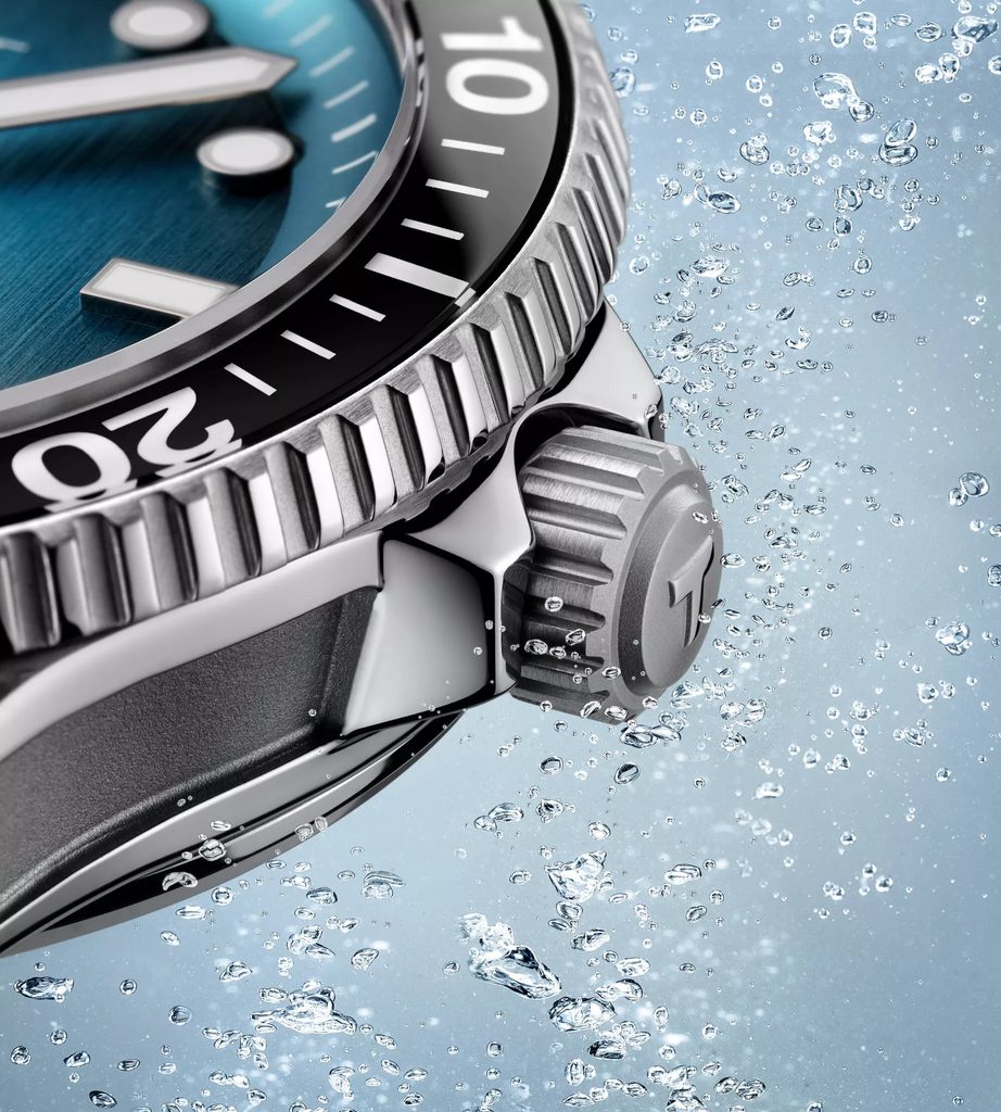 Hodinky sú vyrobené v kombinácii oceľového puzdra a náramku z rovnakého materiálu. Tyrkysový ciferník chráni zafírové sklíčko s antireflexnou vrstvou, ktoré je vysoko odolné voči poškriabaniu. Tento model sa vyznačuje typickým dizajnom potápačských hodiniek, takže samozrejmosťou je výborná čitateľnosť, luminiscencia a jednosmerne otočná potápačská luneta. Vodotesnosť 300 m je podporená skrutkovacou korunkou a zaručuje odolnosť pri takmer akomkoľvek kontakte s vodou vrátane hĺbkového potápania. Na pozícii 6 nájdeme aj ukazovateľ dátumu.