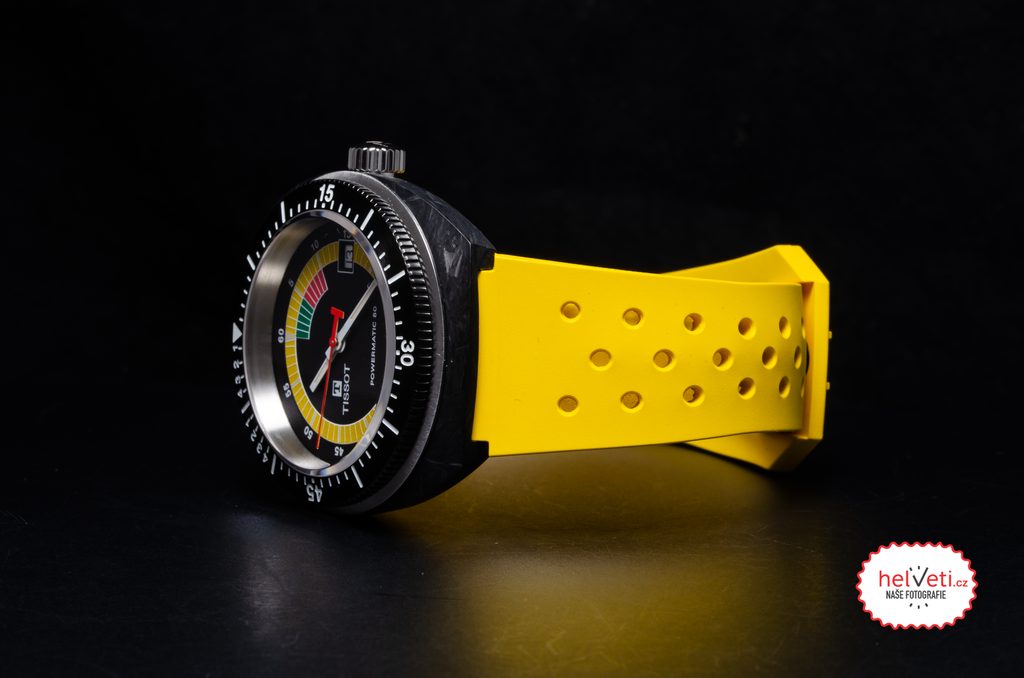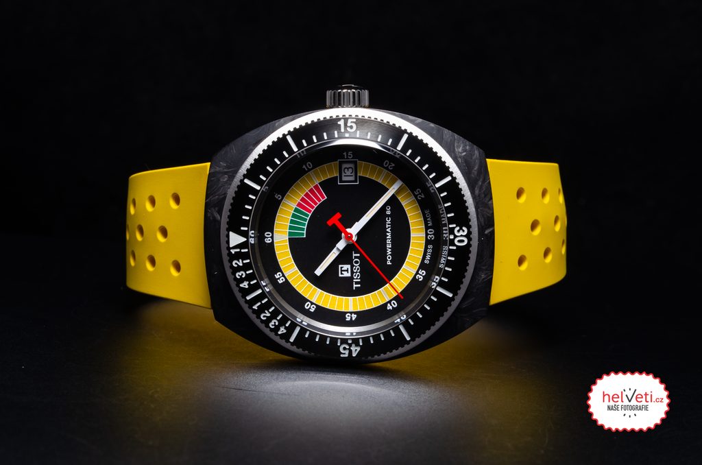Model Tissot Sideral S T145.407.97.057.00 odkazuje na pôvodnú verziu hodiniek z roku 1971, ktorých puzdro bolo vyrobené zo sklených vlákien, čo bol v tom čase inovatívny materiál pre hodinárstvo. Puzdro súčasného modelu je vyrobené z kombinácie ocele (zadné puzdro, korunka) a karbónu. Na čiernom ciferníku, na ktorom sa medzi indexmi 12 a 2 nachádza odpočet pre jachtárske preteky, vyniká žltá minútová stupnica. Súčasťou puzdra je aj jednosmerná otočná luneta so stupnicou pre potápanie a jachtárske preteky. Čítanie času na hodinkách nebude problém ani za zhoršených svetelných podmienok. Nielen ručičky sú pokryté luminiscenciou Super-LumiNova, ale aj celá minútová stupnica a indexy na lunete. Zaujímavosťou je použitie rovnakého loga Tissot na ľavej strane ako na pôvodnom modeli zo 70. rokov.