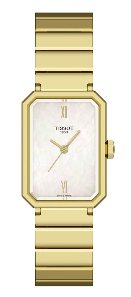 Puzdro v tvare obdĺžnika je vyrobené z ušľachtilej ocele, ktoré dopĺňa náramok z rovnakého materiálu. Puzdro aj náramok majú povrchovú úpravu zo žltého zlata PVD. Charakteristickým prvkom puzdra je aj korunka v tvare šesťuholníka s logom značky. Čistý a elegantne riešený biely perleťový ciferník chráni zafírové sklíčko, ktoré je vysoko odolné proti poškriabaniu.