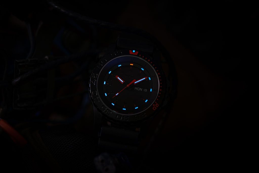 Nie je potrebné nabíjanie ani vystavenie slnečnému svetlu - tajomstvo technológie Trigalight spočíva v použití plynu trícia, ktorý dokáže trvalo vyžarovať svetlo až 20 rokov. Zelená luminiscencia pôvodného modelu sa zmenila na modrú, čitateľnejšiu aj v zakalenej vode, a 12. hodina je označená výraznou červenou bodkou. Takto nebudete hodinky nosiť hore nohami ani v úplnej tme.