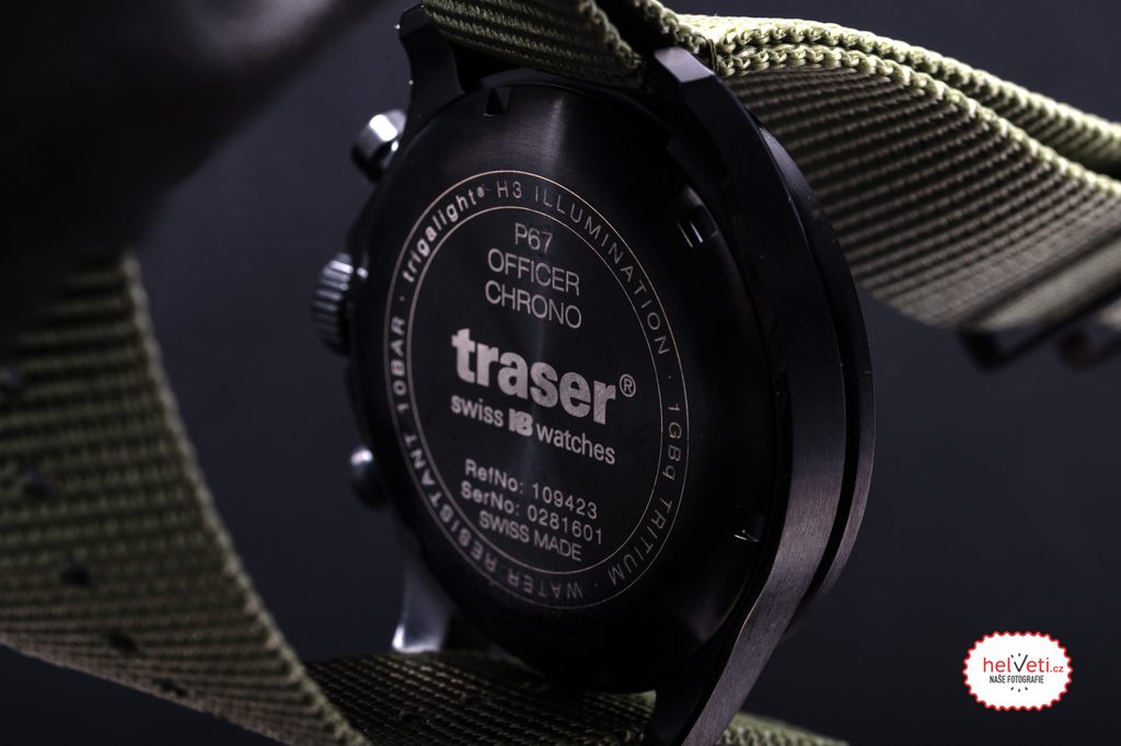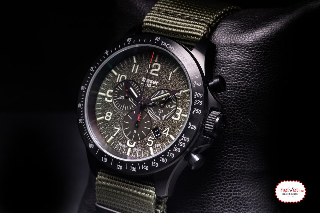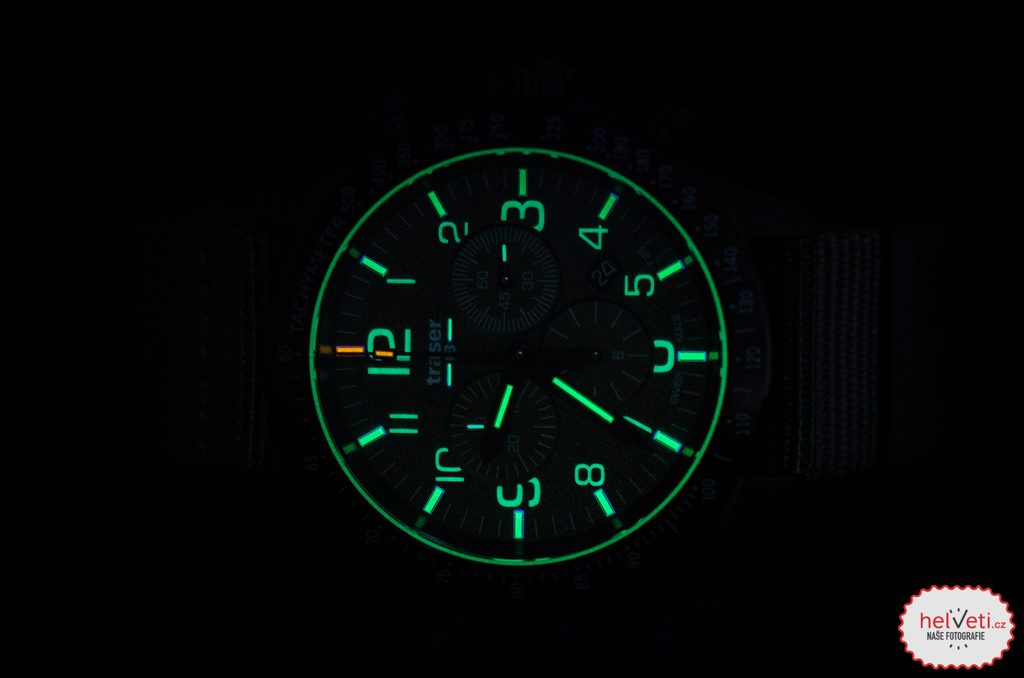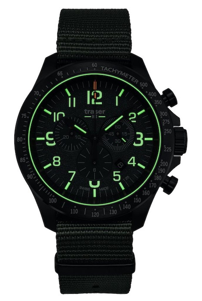 Zafírové sklíčko je obklopené čiernou lunetou s tachymetrom. Číselník je zelený. Luminiscenčný trojsvetlík má zelenú farbu, ktorá je v tme najviditeľnejšia, iba index na 12. hodine je oranžový. Po obvode ciferníka je ďalší prstenec s osvetlením SuperLuminova. S priemerom puzdra 46 mm a výškou necelých 14 mm patria hodinky medzi väčšie hodinky Traser. Na rozdiel od ostatných modelov však nemá takú širokú lunetu, vďaka čomu je opticky menší. Hodinky sa dodávajú na zelenom remienku Nato.