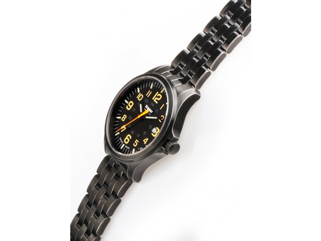 Traser P67 Officer Pro GunMetal Black/Orange vychádza z obľúbeného modelu Traser Officer Pro Sapphire. Zmenu hľadáme okrem iného vo farebnom spracovaní puzdra metódou GunMetal, ktoré je identické s povrchom zbrane a dodáva jej vojenský vzhľad.