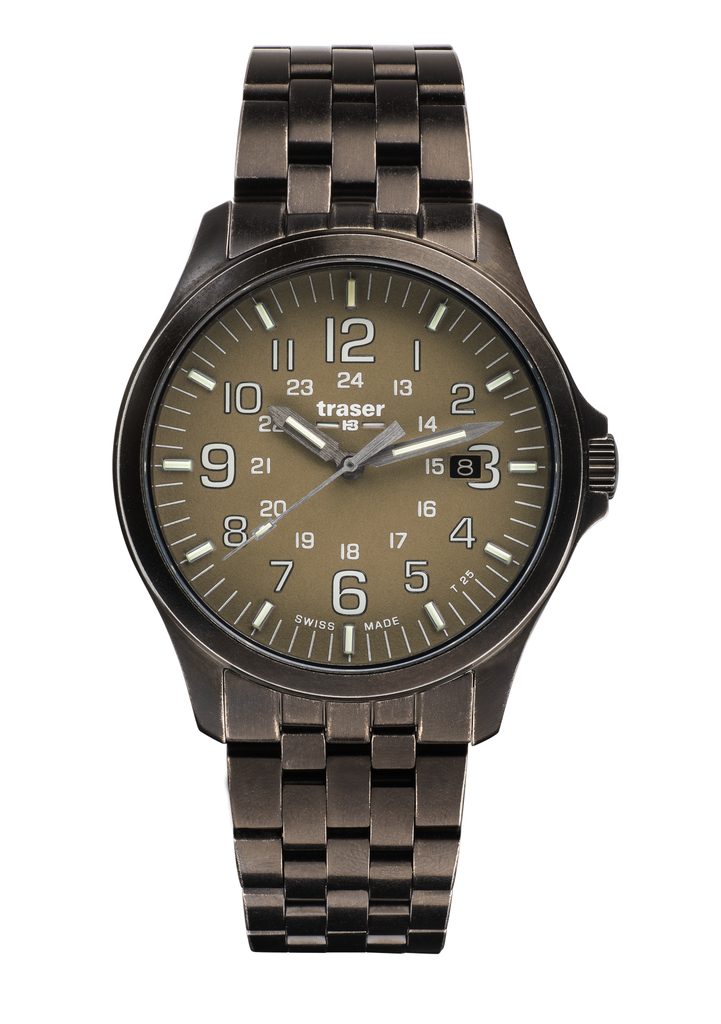 Traser P67 Officer Pro Gunmetal Khaki vychádza z obľúbeného modelu Traser Officer Pro Sapphire. Zmenu hľadáme okrem iného farebného spracovania najmä v začiernení puzdra metódou GunMetal, ktoré je totožné s povrchom zbraní a dodáva im vojenský vzhľad. Z parametrov hodiniek novinka 2018 ponúka ukazovateľ dátumu či antireflexné zafírové sklíčko. To okrem tradičnej odolnosti proti poškriabaniu uspokojuje aj potrebnú čitateľnosť na ostrom slnečnom svetle.