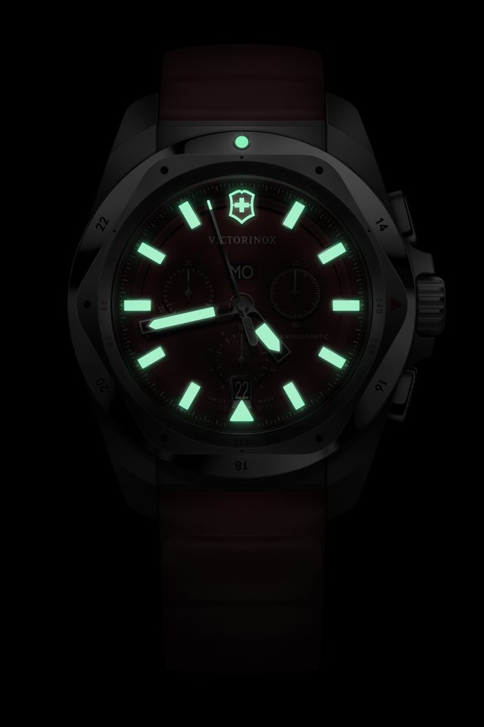 Švajčiarske hodinky Victorinox z modelového radu I.N.O.X. s označením Victorinox I.N.O.X. Chrono 241986 - novinka z roku 2023, ktorá toho veľa vydrží. Oceľové puzdro, skrutkovacia korunka, antireflexné zafírové sklíčko, strojček Ronda 5040.E, ručičky a indexy s luminiscenčnou vrstvou SuperLuminova, remienok z odolnej gumy s rýchloupínacími uzávermi na jednoduchú výmenu v domácnosti a vodotesnosť do 200 metrov - to sú vlastnosti, ktoré stoja za neuveriteľnou odolnosťou.