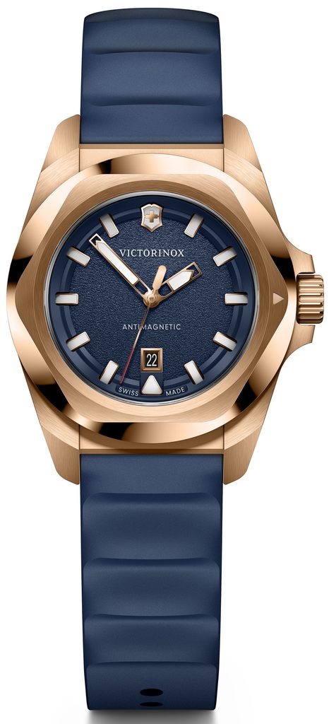 Dámske švajčiarske hodinky Victorinox z modelového radu I.N.O.X. s označením 242035 majú oceľové puzdro so zlatou PVD úpravou, antireflexné zafírové sklíčko, ručičky a indexy s luminiscenčnou vrstvou SuperLuminova, remienok z odolnej gumy a vodotesnosť do 100 metrov - vlastnosti, za ktorými sa skrýva neuveriteľná odolnosť.