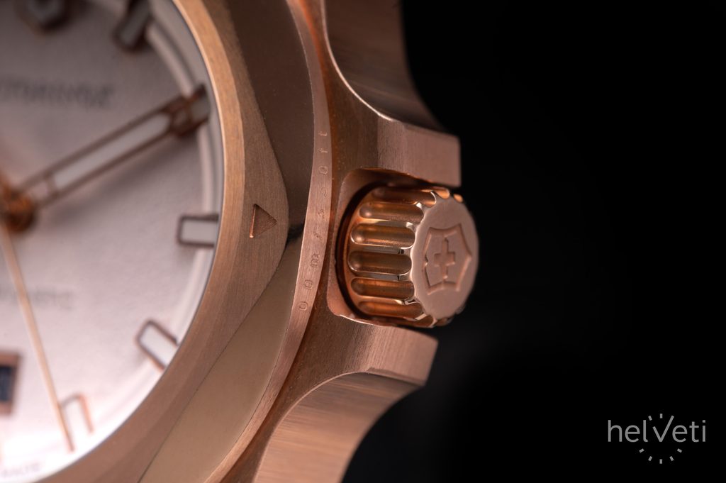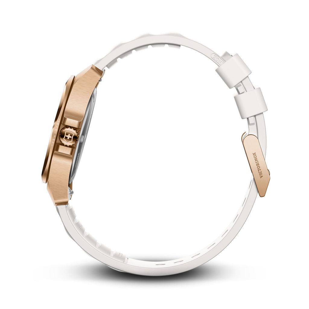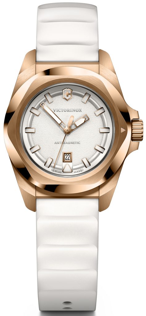 Dámske švajčiarske hodinky Victorinox z modelového radu I.N.O.X. s označením 242037 majú oceľové puzdro so zlatou PVD úpravou, antireflexné zafírové sklíčko, ručičky a indexy s luminiscenčnou vrstvou SuperLuminova, remienok z odolnej gumy a vodotesnosť do 100 metrov - vlastnosti, za ktorými sa skrýva neuveriteľná odolnosť.