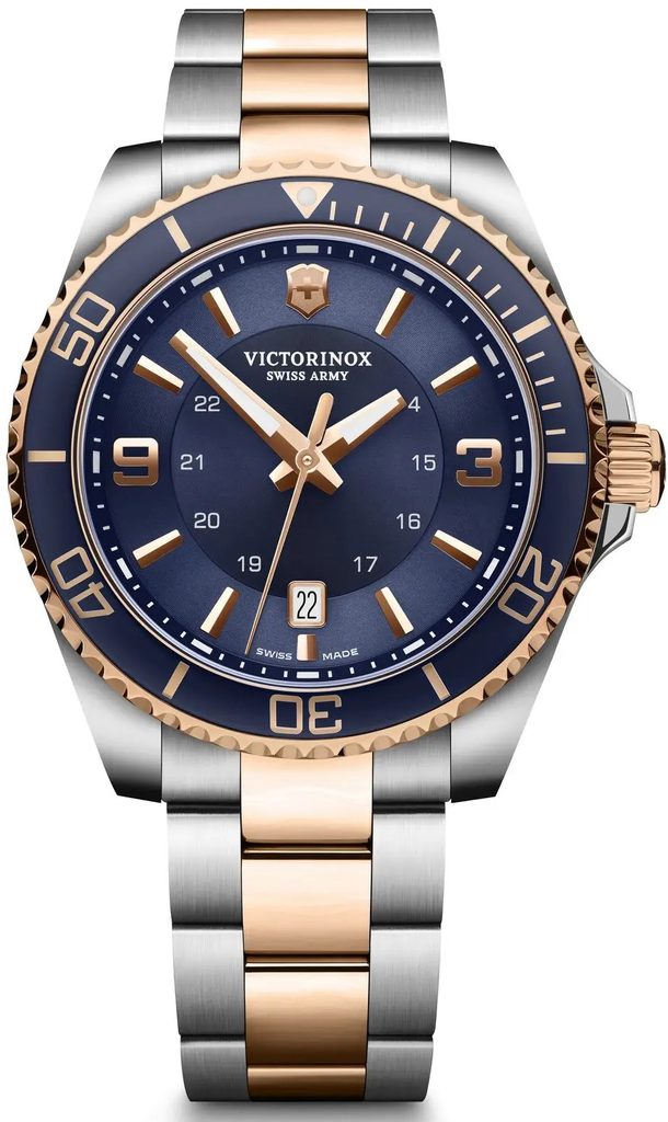Švajčiarske pánske hodinky Victorinox zo série Maverick s číslom modelu 241950 majú okrúhle oceľové puzdro, antireflexné zafírové sklíčko, ukazovateľ dátumu na šiestej pozícii a otočnú lunetu.