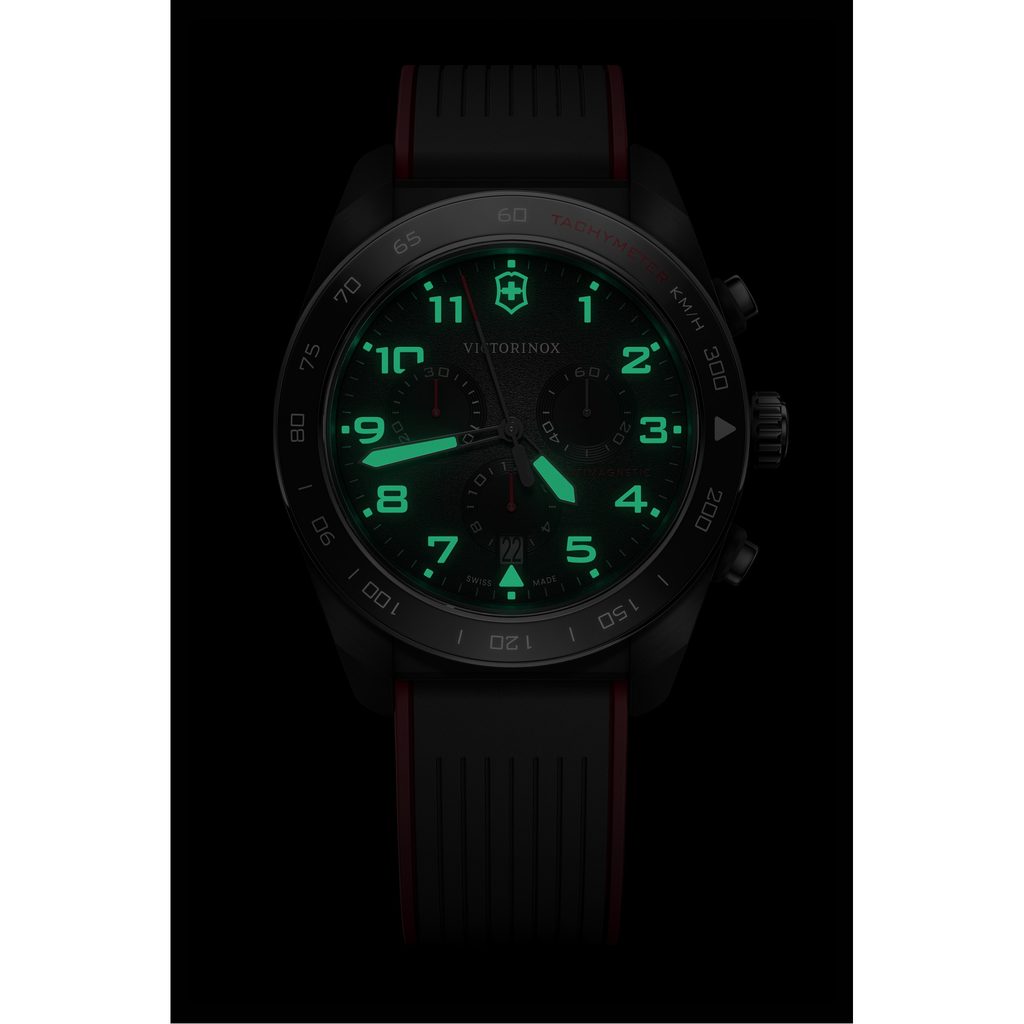 Hodinky Victorinox Swiss Army Chrono 242051 poháňa švajčiarsky quartzový strojček Ronda 5030.D, ktorý je vybavený ukazovateľom dátumu a stopkami. Na ručičkách a reliéfnych čísliciach je bohatá vrstva SuperLuminova.