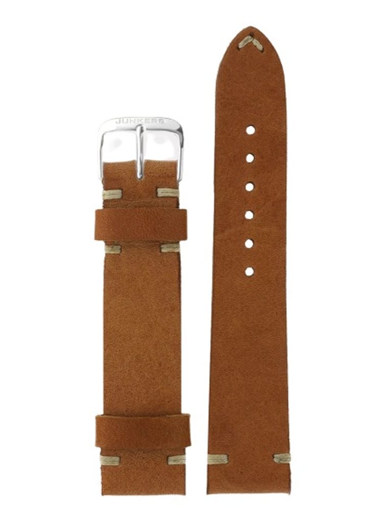 Originálny remienok Junkers v hnedom odtieni vo vintage štýle a so šírkou 20 mm je vyrobený z teľacej kože. Je doplnený striebornou prackou a béžovým prešívaním.
