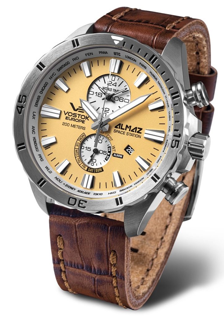Pánske hodinky Vostok Europe Almaz Multifuncional Line YM8J-320A655 z modelového radu Almaz Space Station . Program Almaz bol sériou vojenských vesmírnych staníc, ktoré Sovietsky zväz vyslal do vesmíru pod názvom Saljut. Dve vesmírne stanice Almaz boli úspešne obývané - Saljut 3 a Saljut 5. Súčasťou programu bol vývoj lodí TKS na prepravu kozmonautov a zásob na stanice Almaz, ale nakoniec kozmonautov na stanice dopravovali lode Sojuz. Lode TKS sa testovali len v bezpilotnom režime; lety s posádkou boli zrušené.