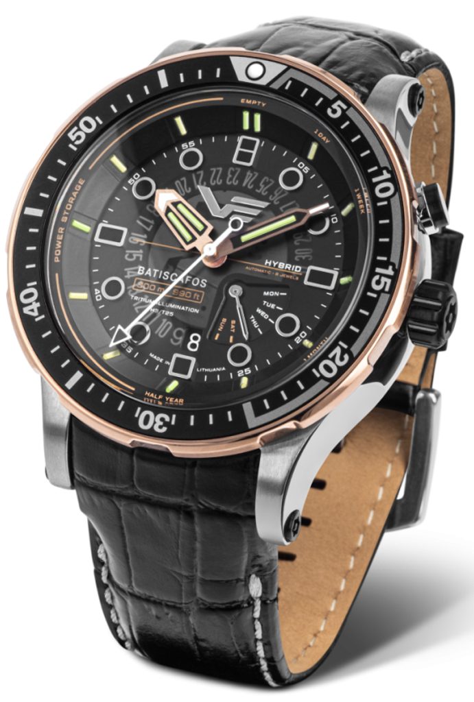 Pánske hodinky Vostok Europe Batiscafos Hybrid PX84-511E769 predstavujú úplne nový modelový rad s názvom Batiscafos. Názov"Batiscafos" pochádza z gréckeho "bathys" (hlboký) a "skaphos" (loď). Plavidlá ako legendárna loď Trieste, ktorá sa v roku 1960 potopila na dno Mariánskej priekopy (10 984 ± 25 metrov), symbolizujú odhodlanie skúmať neznáme.
