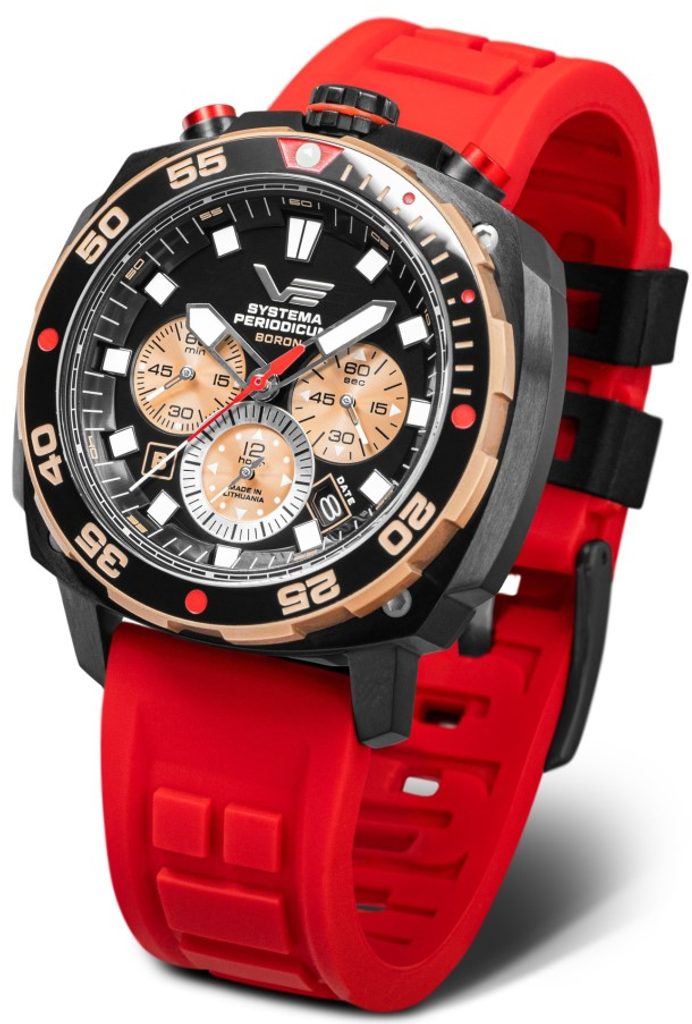 Puzdro hodiniek Vostok Europe Systema Periodicum Boron VK67-650E721 je vyrobené z nehrdzavejúcej ocele s čiernou PVD úpravou. Dominantou puzdra je jednosmerná otočná luneta z kubickej zirkónovej keramiky s pozlátenou povrchovou úpravou. Vo vnútri sa nachádza japonský strojček Seiko VK67 poháňaný batériou. Ten je vybavený praktickým ukazovateľom dátumu a ponúka aj funkciu stopiek. Ručičky a indexy sú pokryté luminiscenčnou vrstvou Superluminova.
