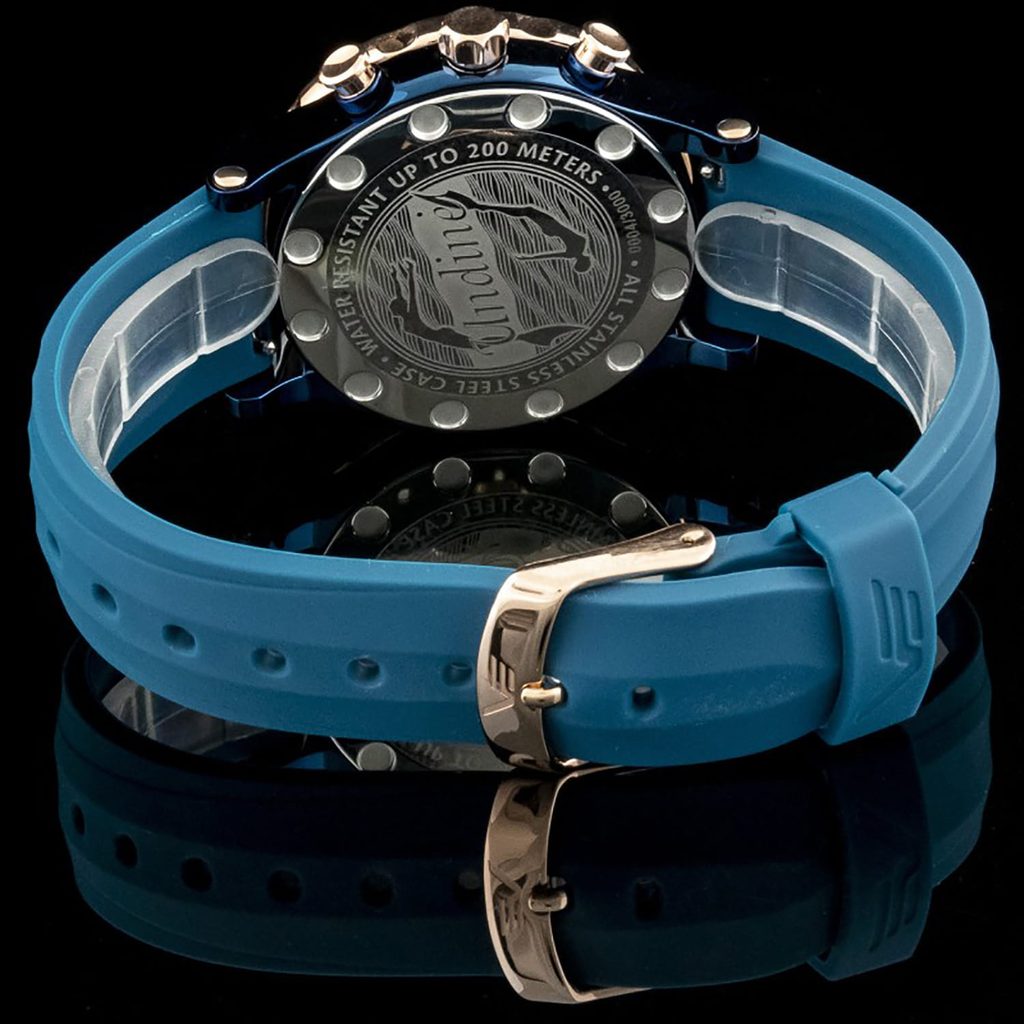 Puzdro hodiniek Vostok Europe Undine VK64-515E628 je vyrobené z ušľachtilej ocele s modrou PVD úpravou a pozlátenou lunetou. Vo vnútri sa nachádza japonský strojček Seiko VK64 na batériový pohon. Má stopky a ukazovateľ dátumu. Subciferník na pozícii 3 slúži ako ukazovateľ času v 24-hodinovom formáte. Modrý gilošovaný ciferník chráni tvrdené minerálne sklíčko K1 s antireflexnou úpravou.
