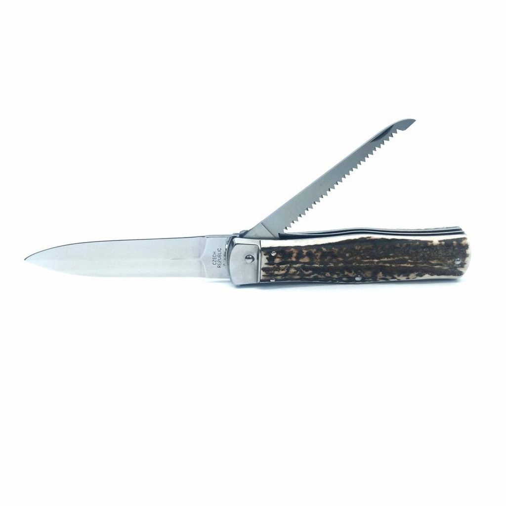 Čepeľ noža je vyrobená z kvalitnej nehrdzavejúcej ocele 420 s tvrdosťou 52-55 HRc. Pochva je vyrobená z pravého jelenieho parožia, ktoré je medzi poľovníkmi a milovníkmi prírody veľmi obľúbené. Jeho tvar zaručuje nielen pohodlné a pevné uchopenie, ale zabraňuje aj skĺznutiu ruky a poraneniam. Okrem klasickej čepele je nôž vybavený aj pílou.