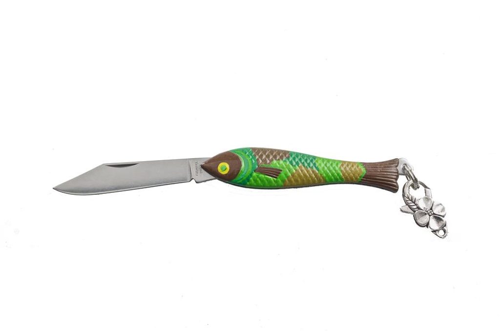 Camouflage je celoplošne potlačený legendárny vreckový nôž Rybička. Patrí medzi dekoratívne obrázkové nože, ktoré sú potlačené špeciálnou technológiou UV LED. Je preto vhodný ako darček na rôzne príležitosti. Kým čepeľ noža je vyrobená z nehrdzavejúcej ocele 420 s tvrdosťou 52-55 HRc, záštita je zo zliatiny zinku. Nôž je vybavený aj ozdobnou karabínou.