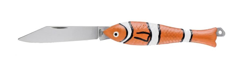 Klaun je legendárny vreckový nôž Rybička s plnofarebnou potlačou. Patrí medzi dekoratívne obrázkové nože, ktoré sú potlačené špeciálnou technológiou UV LED. Je preto vhodný ako darček na rôzne príležitosti. Čepeľ noža je vyrobená z nehrdzavejúcej ocele 420 s tvrdosťou 52-55 HRc a ostrie zo zliatiny zinku. Nôž je tiež vybavený ozdobnou karabínou.