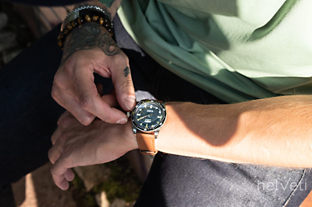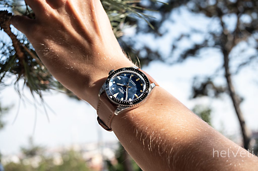 Hodinky Skindiver Nautique majú všetky atribúty potápačských hodiniek, o čom svedčia výnimočne čitateľné ručičky a indexy so zvýraznenou technológiou Super-Luminova, ktoré majú povrchovú úpravu v khaki hnedej farbe pre elegantný kontrast pri dennom svetle a ponúkajú lepšiu čitateľnosť pri slabom osvetlení. Jednosmerne ryhovaná luneta s čiernou keramickou vložkou a kontrastnými bielymi značkami. Hodinky sú navrhnuté do hĺbky 200 metrov a majú ideálne rozmery 38 mm puzdra z nehrdzavejúcej ocele.