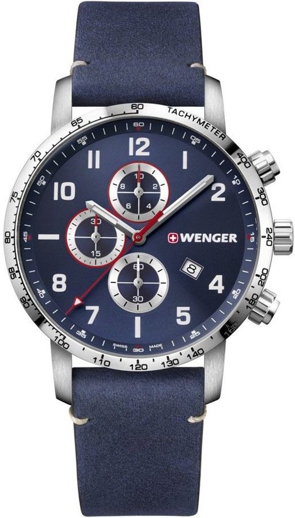Hodinky Wenger Attitude Chrono 01.1543.109 vychádzajú na jar 2018. Hodinky Attitude Chrono sa vyznačujú veľkým oceľovým puzdrom s výraznými tlačidlami stopiek na pravej strane. Prednosťou tohto modelu je minerálne sklo so zafírovou vrstvou. Veľký prehľadný ciferník má po obvode dobre čitateľné luminiscenčné indexy. V strede sa nachádzajú tri malé ciferníky. Dva pre stopky s presnosťou na 1/10 sekundy a spodný pre sekundovú ručičku. Na lunete hodiniek sa nachádza tachymeter na meranie pohybujúcich sa objektov.