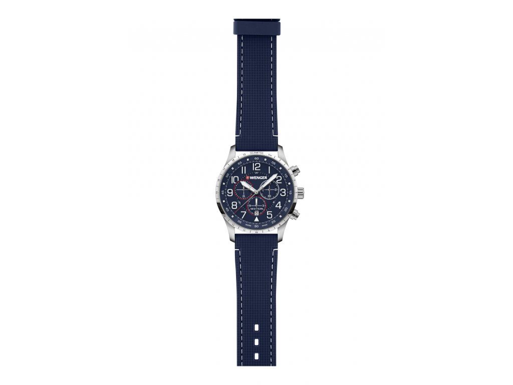 Hodinky vám budú držať na zápästí vďaka gumovému remienku. Jednoduchú výmenu popruhov zabezpečuje rýchloupínací systém. Za zmienku stojí aj signovaná korunka so švajčiarskym krížom umiestnená klasicky na pravej strane puzdra. Ako sme u spoločnosti Wenger zvyknutí, myslí sa aj na praktickú stránku veci, a preto sú hodinky vodotesné do 10 ATM. Vďaka tejto vodotesnosti sa nemusíte obávať ísť s hodinkami do bazéna alebo do mora.