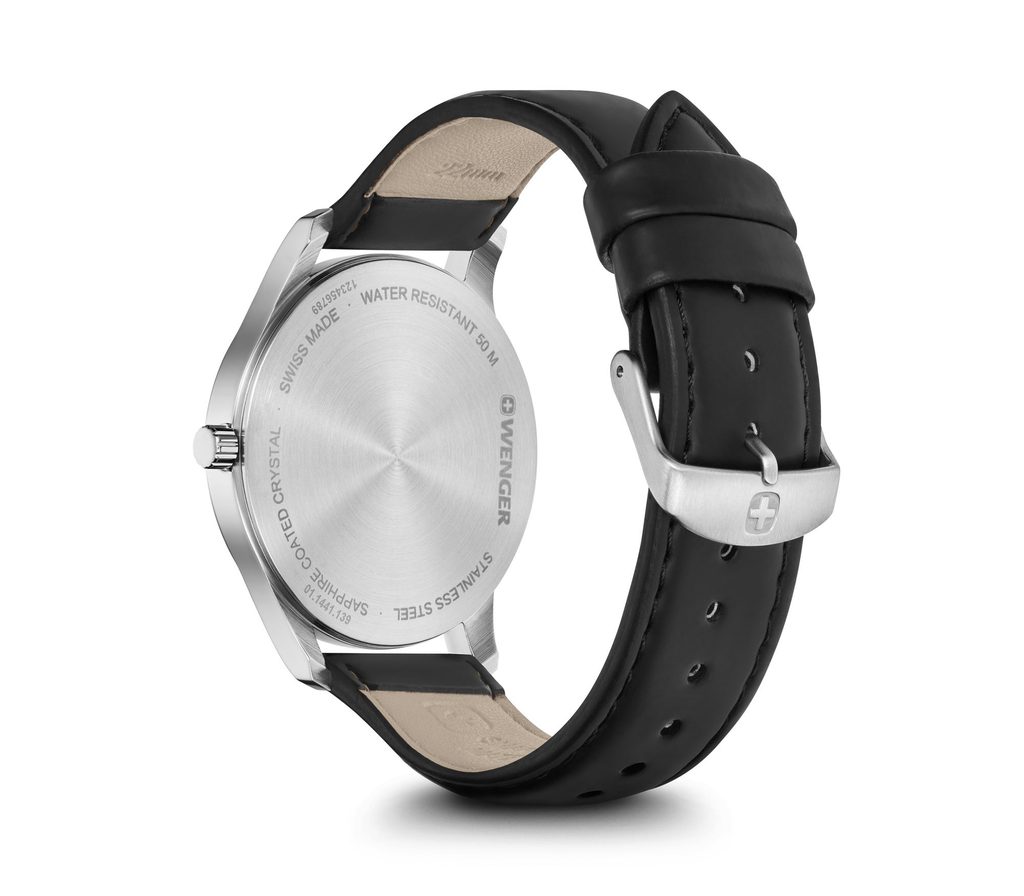 Tento pánsky model ponúka predovšetkým vysoko elegantný vzhľad, ktorý sa bude hodiť k formálnemu obleku, minerálne sklíčko so zafírovou vrstvou a vodotesnosť 5 ATM, s ktorou hodinky zvládnu aj ručné umývanie. Prehľadnému ciferníku dominuje červený švajčiarsky kríž na 12. hodine, ktorý spoločnosť Wenger používala na svojich prvých modeloch hodiniek. Na pozícii 3 hodín je jednoduchý ukazovateľ dátumu na bielom pozadí. Nie príliš bežným riešením je zobrazenie indexov rímskymi číslicami.