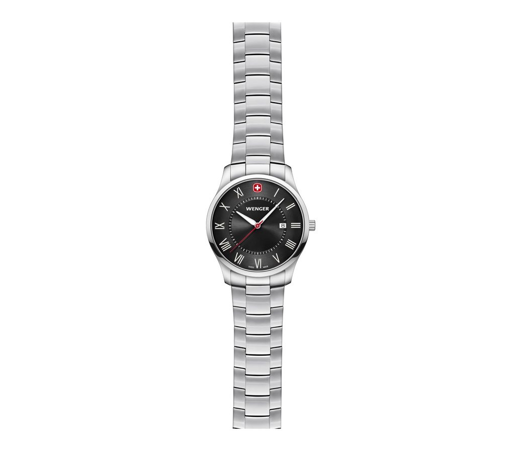 Tento pánsky model ponúka predovšetkým vysoko elegantný vzhľad, ktorý sa bude hodiť k formálnemu obleku, minerálne sklíčko so zafírovou vrstvou a vodotesnosť 5 ATM, s ktorou hodinky zvládnu aj ručné umývanie. Prehľadnému ciferníku dominuje červený švajčiarsky kríž na 12. hodine, ktorý spoločnosť Wenger používala na svojich prvých modeloch hodiniek. Na pozícii 3 hodín je jednoduchý ukazovateľ dátumu na bielom pozadí. Nie príliš bežným riešením je zobrazenie indexov rímskymi číslicami.