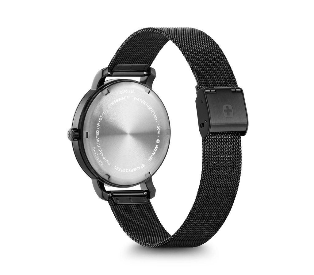 Dámske náramkové hodinky z novo predstaveného modelového radu Metropolitan Donnissima. Hodinky Wenger Metropolitan Donnissima 01.1731.124 sú vhodné na každodenné nosenie, ale aj do spoločnosti. Ciferník vás na prvý pohľad zaujme tromi kameňmi Swarovski na pozícii tretej hodiny. Hodinky majú oceľové puzdro a jemne tkaný sieťovaný náramok s PVD úpravou. Vodotesnosť tohto modelu je 100 m. V tomto modelovom rade oceníte minerálne sklíčko so zafírovou vrstvou.