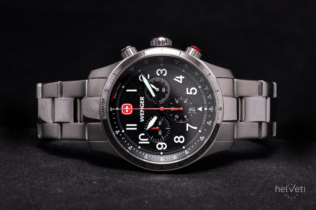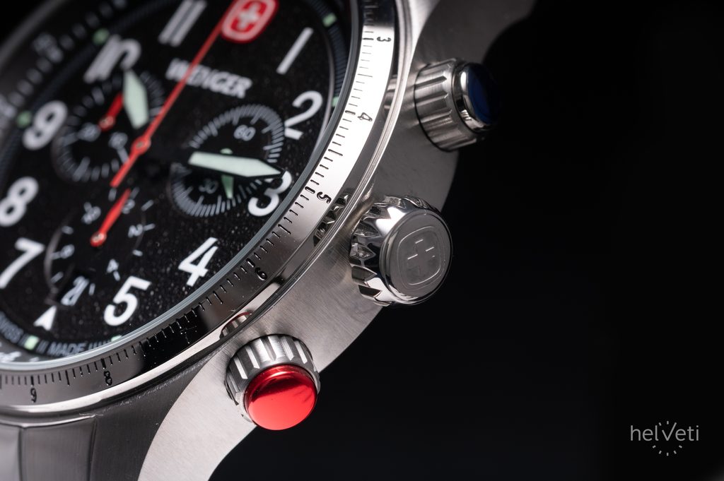 Hodinky vám na zápästí zostanú vďaka oceľovému náramku. Jednoduchú výmenu remienka zabezpečuje systém rýchleho zapínania. Za zmienku stojí aj gravírovaná signovaná korunka so švajčiarskym krížom umiestnená klasicky na pravej strane puzdra. Ako sme u značky Wenger zvyknutí, aj tu sa myslí na praktickú stránku veci, a preto sú hodinky vodotesné do 10 ATM. Vďaka tejto vodotesnosti sa nemusíte obávať ísť si s hodinkami zaplávať.